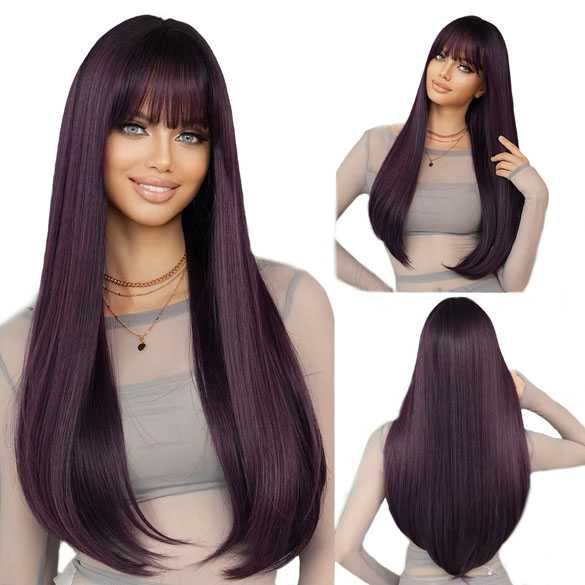Luxe pruik lang steil haar donkerpaars met pony