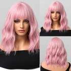 Pruik schouderlang hennarood haar met wave slagen. Model met pony.