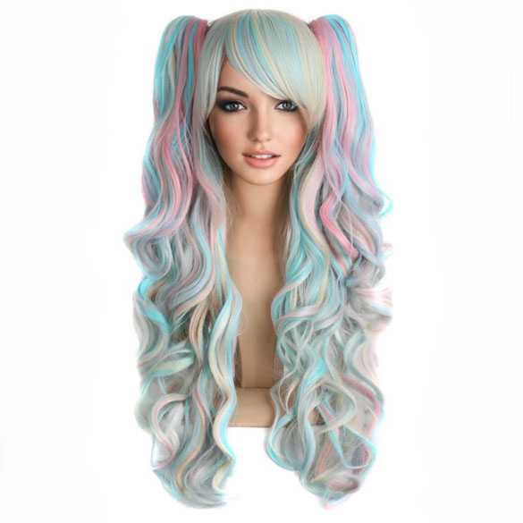 Pastel multi-color pruik lang krullend haar + 2 staarten