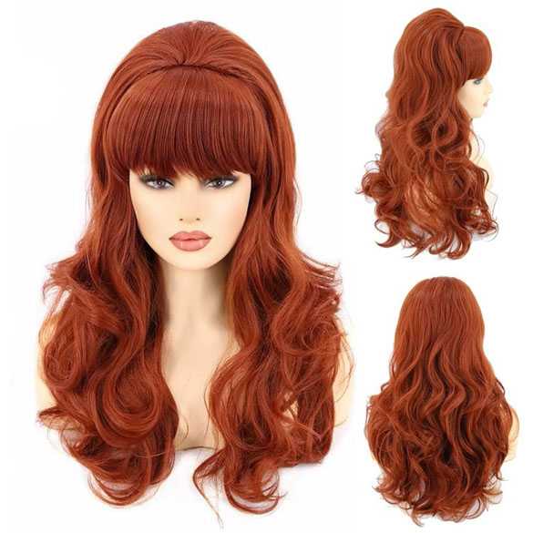 Luxe Peggy Bundy pruik met lang rood krullend haar en rechte pony. Uit de tv serie Married with children in de jaren 80 / 90. Ook geschikt voor Drag.