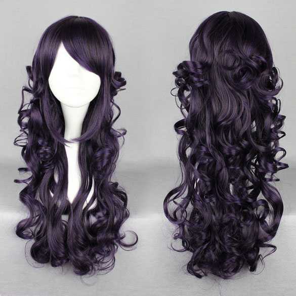 € 37,95Luxe pruik met lang nonchalant krullend haar donkerpaars. Model met pony naar de zijkant weggestoken.