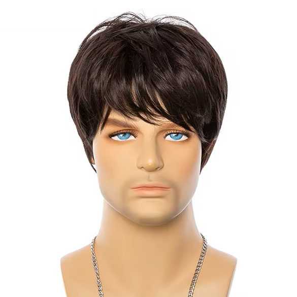 Herenpruik kort bruin steil haar in laagjes. Model met pony.