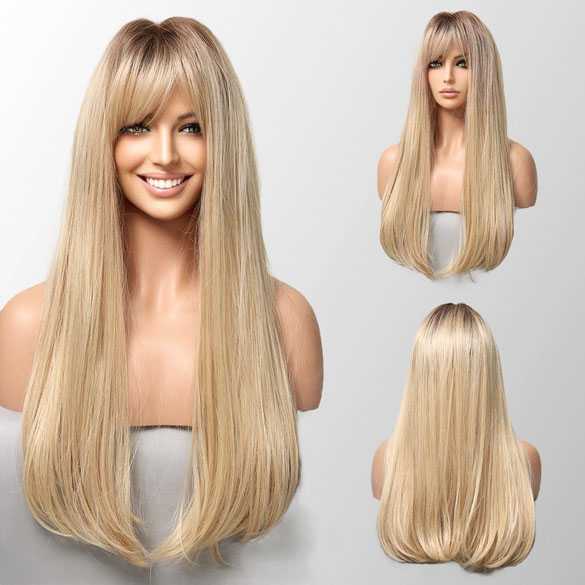Pruik lang blond steil haar met pony model 021