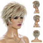 Pruik met kort krullend haar in laagjes. Model met pony.