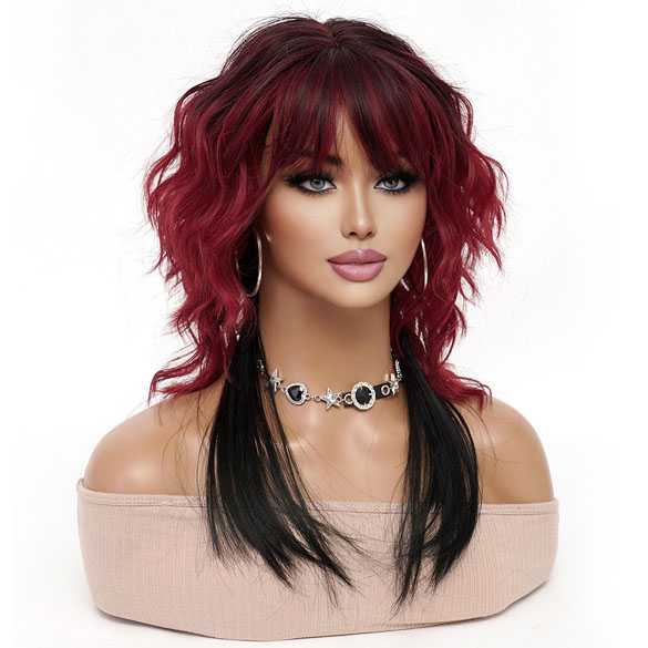 Trendy wavy pruik wijnrood / zwart met langere onderlaag