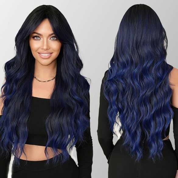 Luxe pruik lang golvend haar zwart blauw