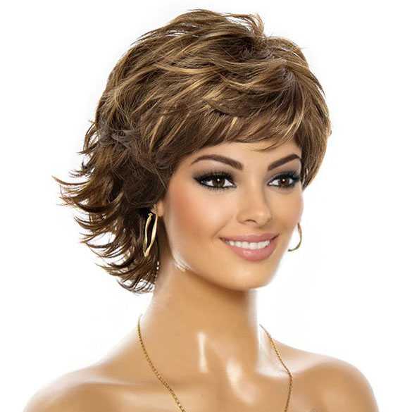 Pruik kort modern warrig kapsel in laagjes met highlights. Model met pony. Top met permatease steunharen.