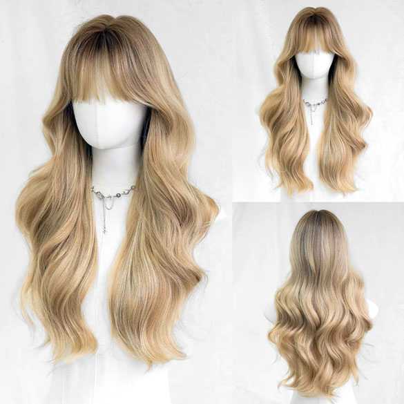Pruik lang haar met slagen in lagen met natuurlijke donkere uitgroei. Model met pony. Haarkleur is goudblond. Scheiding met huidimitatie.