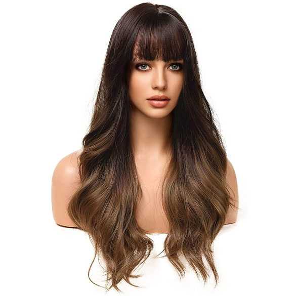Pruik lang haar in laagjes met grove slagen. Model met pony. Scheiding met stukje huidimitatie.
