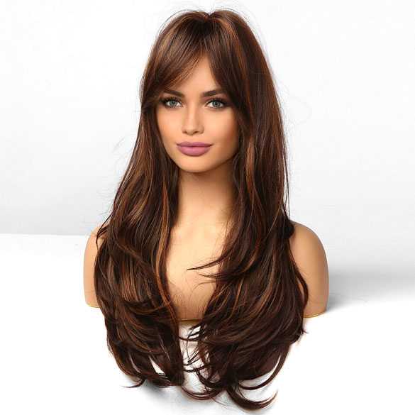 Pruik medium donkerbruin lang krullend haar met highlights model 353 2