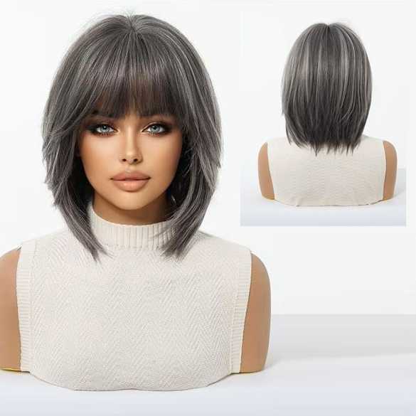 Pruik bob model grijsmix met steil haar model 1304